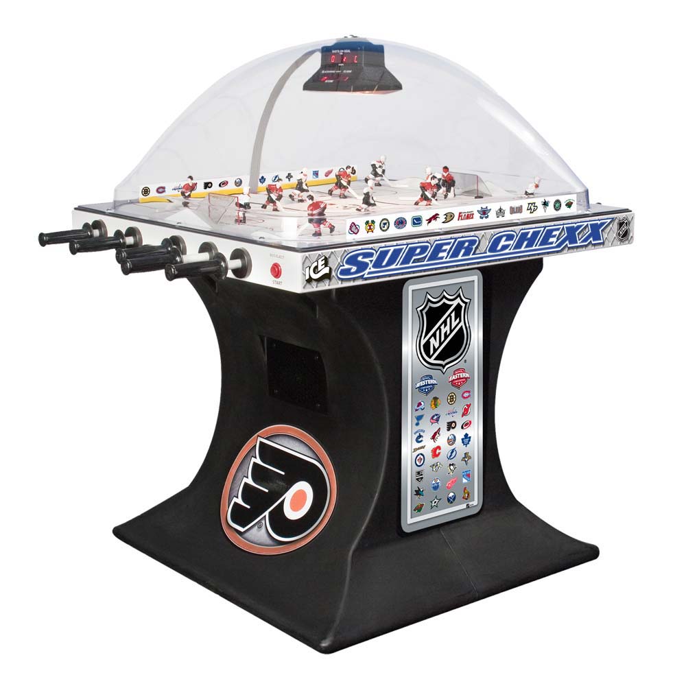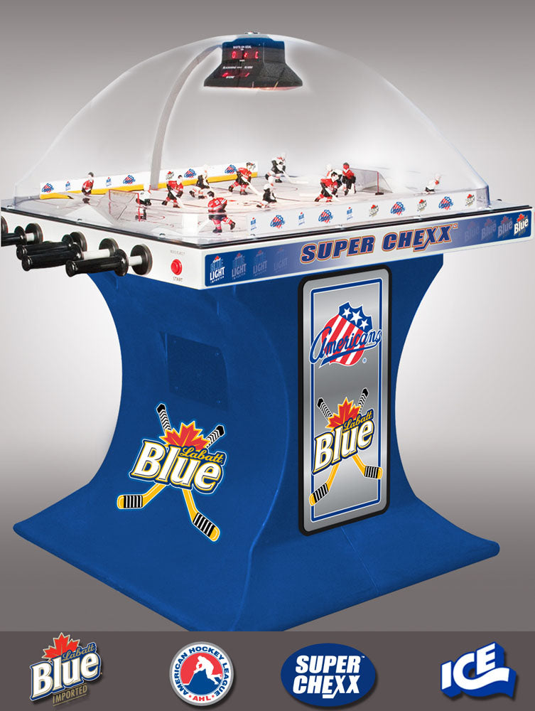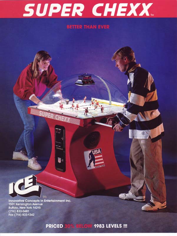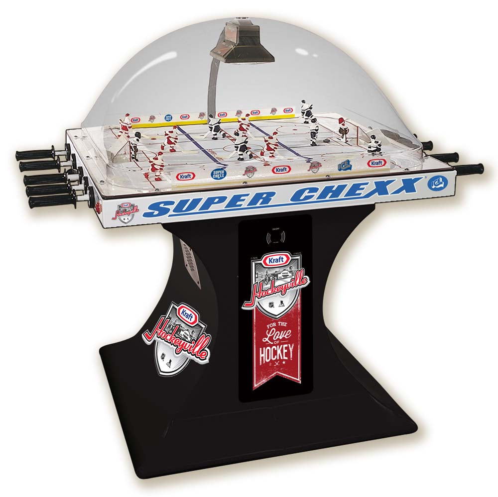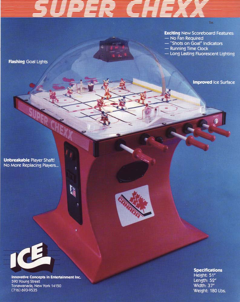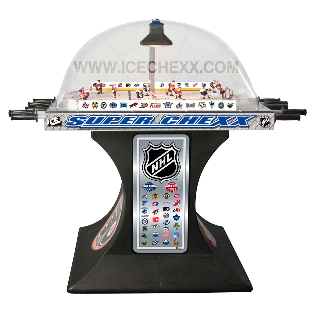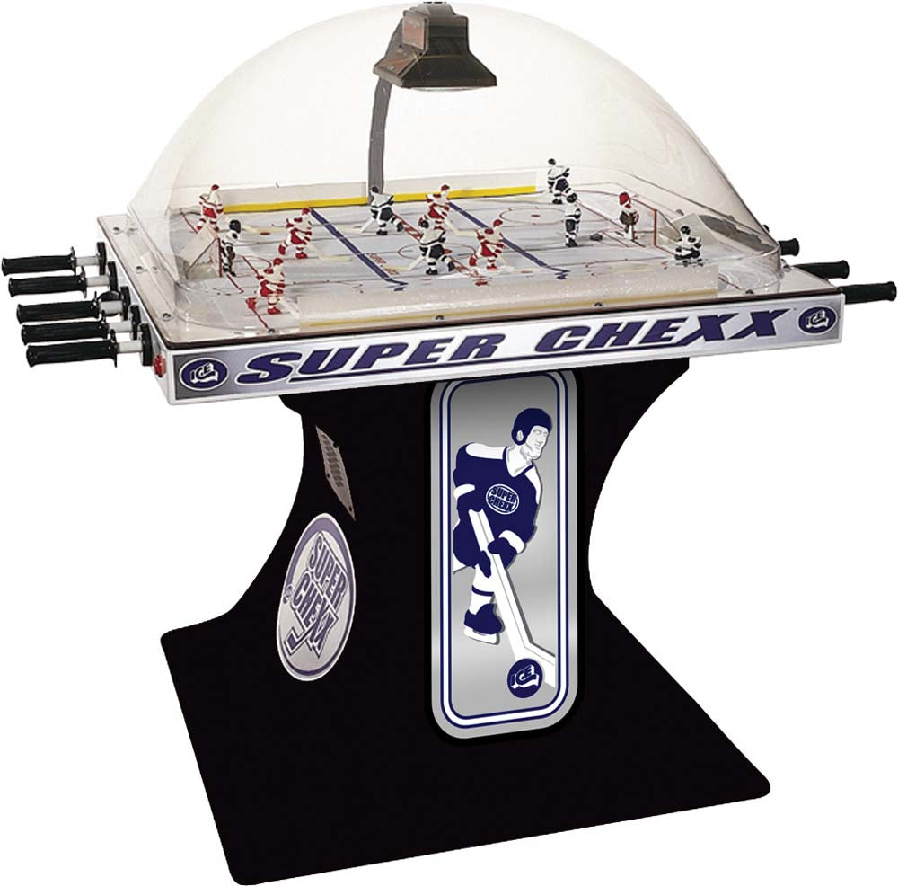 Own the only arcade quality bubble hockey game made in the world today at Factory Direct prices from www.superchexx.com. Over the years the coin-operated success of CHEXX and SUPER CHEXX has spawned imitation dome hockey games engineered and built overseas with cheap materials and less reliable parts, marketed to the home market at discount prices. Don't be fooled by knock-offs! Live action game sound, electronic scoring and made in the USA quality at the ICE factory near Buffalo, NY make SUPER CHEXX the only bubble hockey, dome hockey, rod hockey or table hockey choice for rinks, sports bars and arcades across the world. Now with ICE Factory Direct pricing and a Deluxe Home edition, this all-time arcade classic is priced right for your home or business. The superior engineering, quality materials like the lexan dome, kydex ice surface, brushed aluminum cabinet, Delrin players & long-lasting gear boxes have proven their durability over the last 30 years. Combined with free lifetime tech support and in-stock parts at the ICE factory in Clarence, NY, SUPER CHEXX bubble hockey has been the premium dome hockey, rod hockey or table hockey brand for three decades. Now with ICE Factory Direct pricing, it is also the clear choice for your home game room or business break room. Compare made in the USA Super Chexx bubble hockey to knock-off dome or rod hockey games from Stiga, Carrom, Shelti, Performance Games, Holland Bar Stool or Halex and you will see and feel the difference. Don't be fooled by imitation games advertised at lower prices that claim to be "just like a Super Chexx". No other dome hockey, rod hockey or table hockey brand offers the mix of arcade quality ICE manufacturing, fast-paced game play, live sound calls by Rick Jeanneret, electronic scoring & shot clock, custom graphics and licensed editions with hand-painted replica jerseys. SUPER CHEXX is the ultimate home game for hockey fans all over the world and guaranteed to deliver years of fun for your family and friends. There are many Chexx games built in the 1980's still being played today!