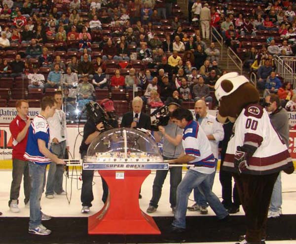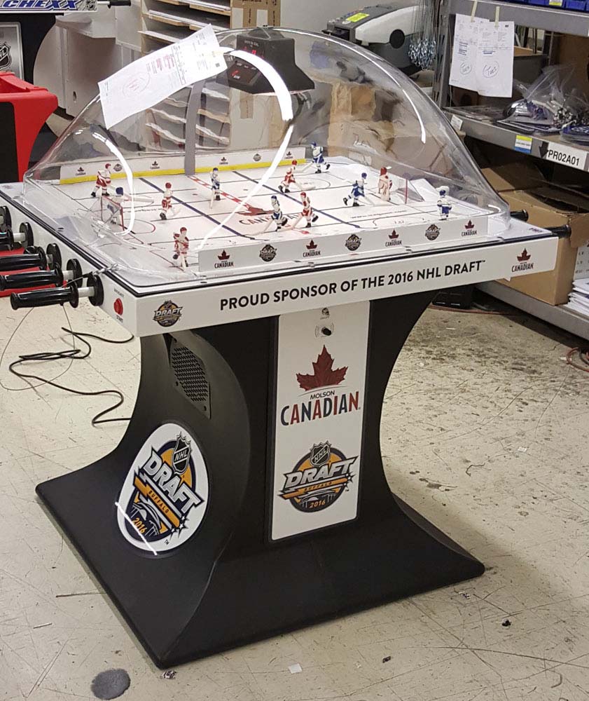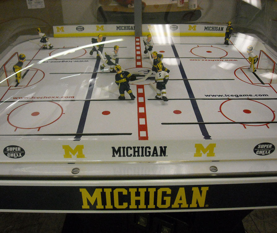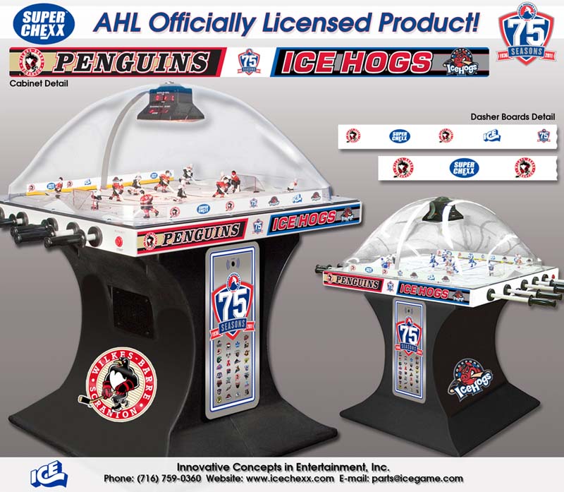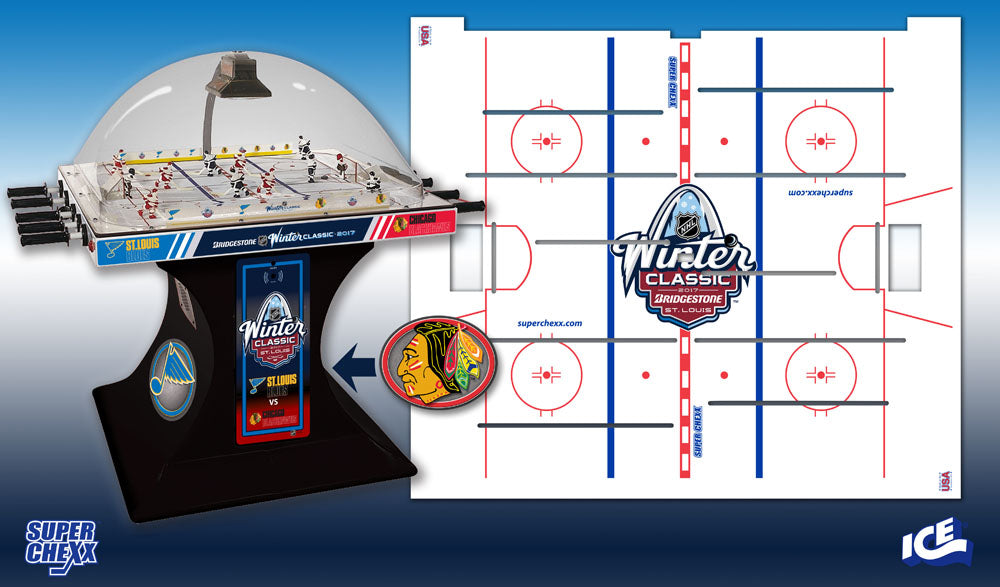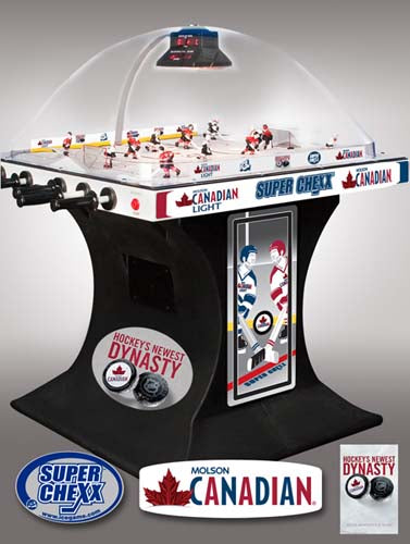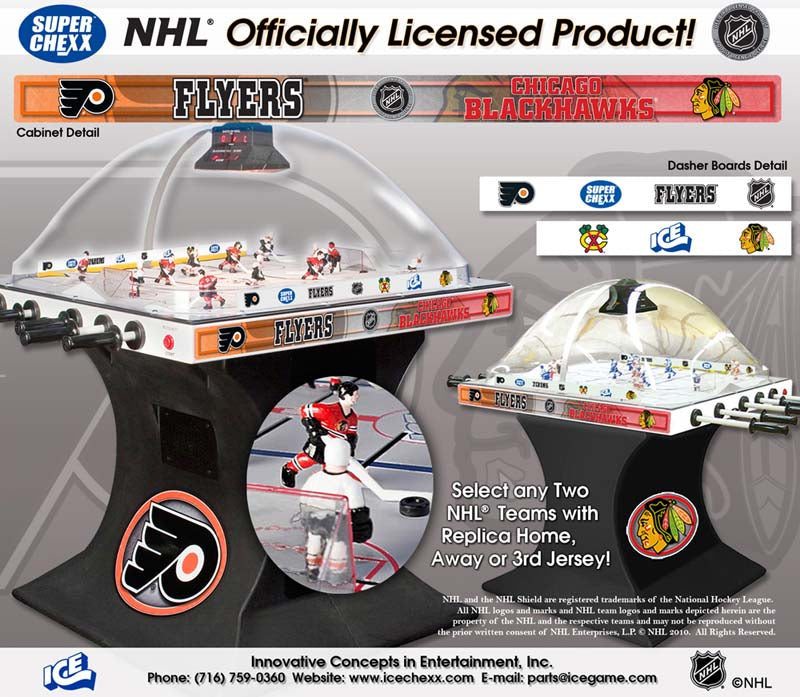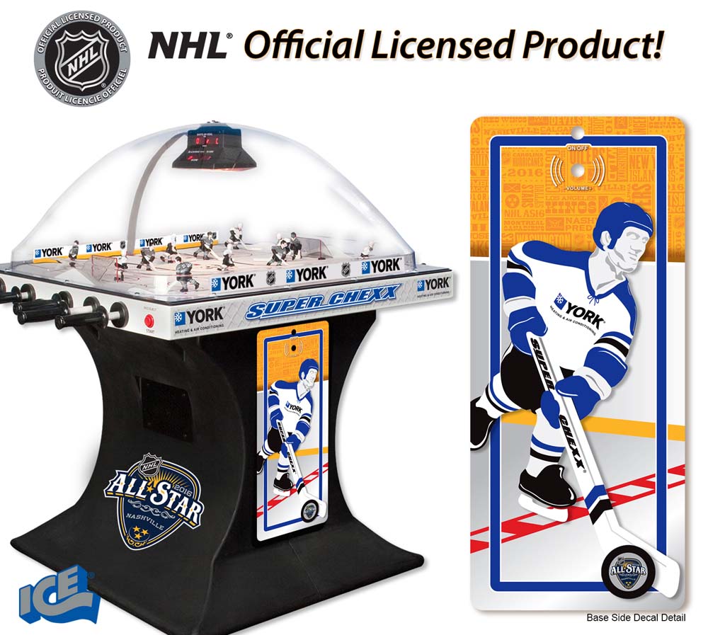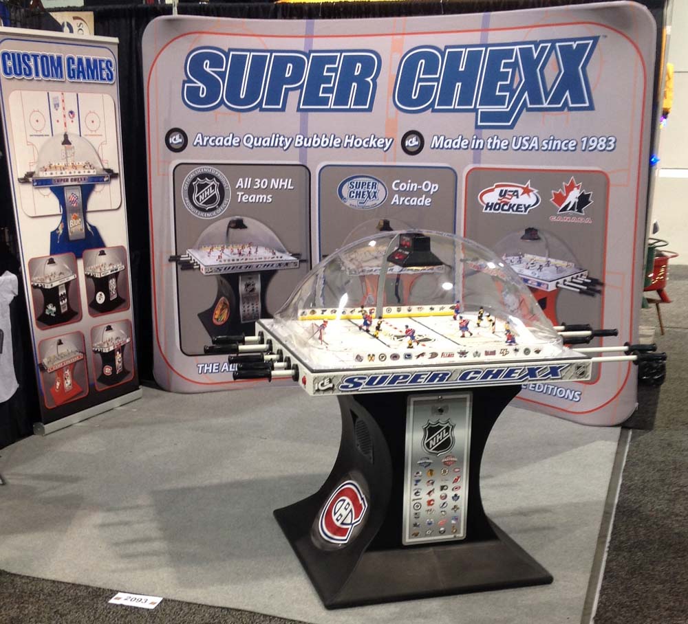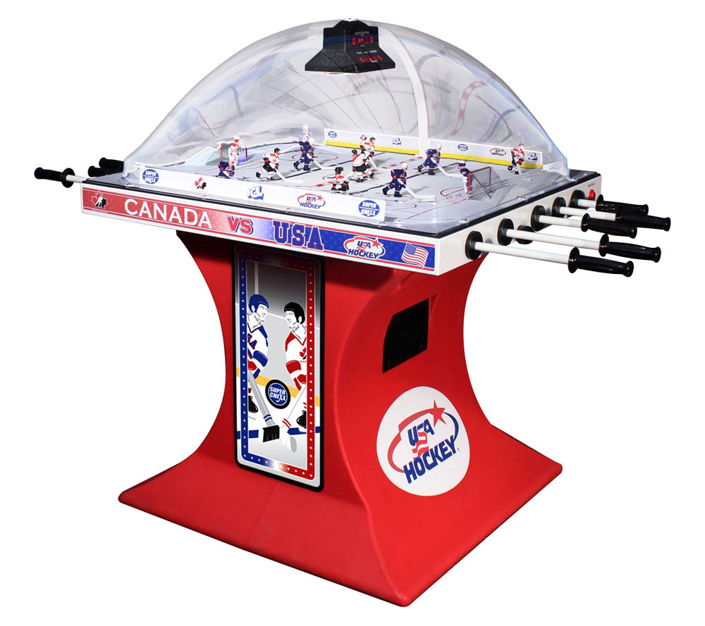 Own the only arcade quality bubble hockey game made in the world today at Factory Direct prices from www.superchexx.com. Over the years the coin-operated success of CHEXX and SUPER CHEXX has spawned imitation dome hockey games engineered and built overseas with cheap materials and less reliable parts, marketed to the home market at discount prices. Don't be fooled by knock-offs! Live action game sound, electronic scoring and made in the USA quality at the ICE factory near Buffalo, NY make SUPER CHEXX the only bubble hockey, dome hockey, rod hockey or table hockey choice for rinks, sports bars and arcades across the world. Now with ICE Factory Direct pricing and a Deluxe Home edition, this all-time arcade classic is priced right for your home or business. The superior engineering, quality materials like the lexan dome, kydex ice surface, brushed aluminum cabinet, Delrin players & long-lasting gear boxes have proven their durability over the last 30 years. Combined with free lifetime tech support and in-stock parts at the ICE factory in Clarence, NY, SUPER CHEXX bubble hockey has been the premium dome hockey, rod hockey or table hockey brand for three decades. Now with ICE Factory Direct pricing, it is also the clear choice for your home game room or business break room. Compare made in the USA Super Chexx bubble hockey to knock-off dome or rod hockey games from Stiga, Carrom, Shelti, Performance Games, Holland Bar Stool or Halex and you will see and feel the difference. Don't be fooled by imitation games advertised at lower prices that claim to be "just like a Super Chexx". No other dome hockey, rod hockey or table hockey brand offers the mix of arcade quality ICE manufacturing, fast-paced game play, live sound calls by Rick Jeanneret, electronic scoring & shot clock, custom graphics and licensed editions with hand-painted replica jerseys. SUPER CHEXX is the ultimate home game for hockey fans all over the world and guaranteed to deliver years of fun for your family and friends. There are many Chexx games built in the 1980's still being played today!