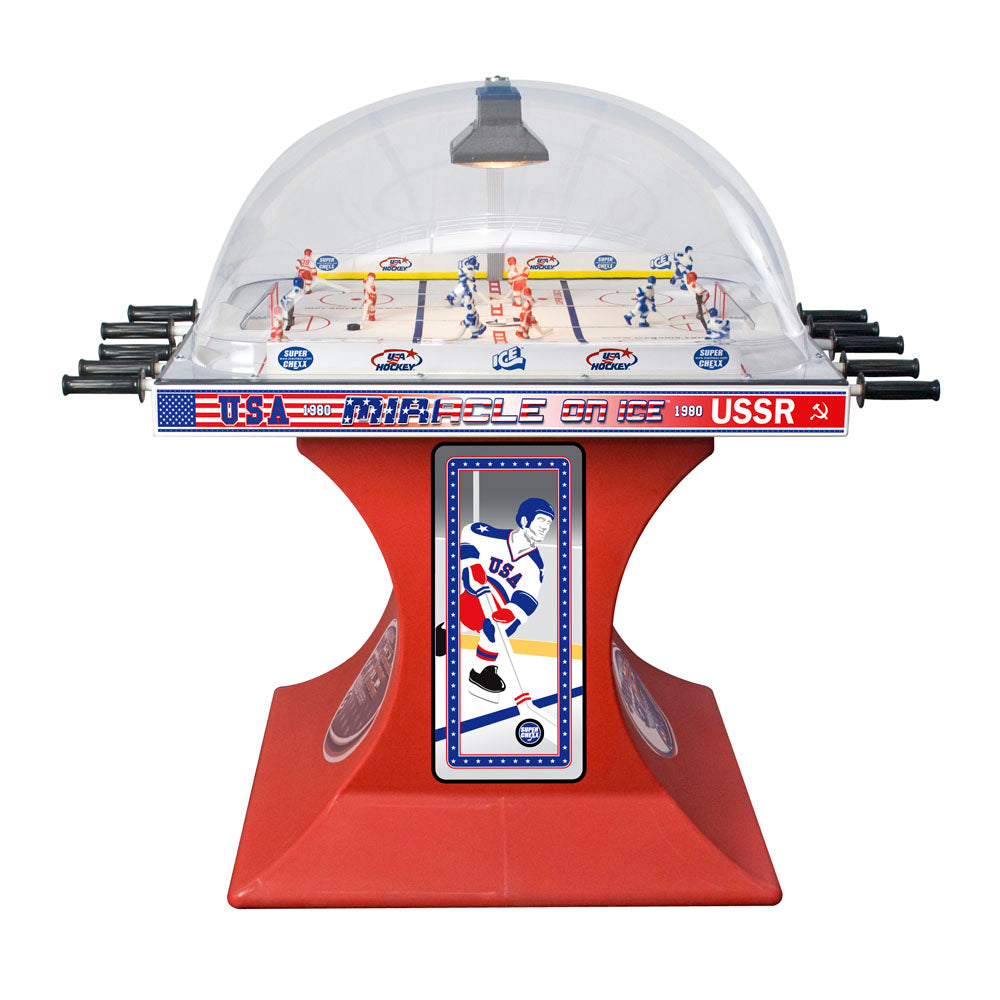 SUPER CHEXX is an official licensed bubble hockey, dome hockey, rod hockey and table hockey game of the National Hockey League, USA Hockey and Hockey Canada. You can now order fully licensed games with the USA vs CCCP teams from the 1980 Miracle on ICE, Team USA vs Team Canada or any of the 31 current NHL: Boston Bruins, Buffalo Sabres, Calgary Flames, Carolina Hurricanes, Chicago Blackhawks, Colorado Avalanche, Columbus Blue Jackets, Dallas Stars, Detroit Red Wings, Edmonton Oilers, Florida Panthers, LA Kings, Minnesota Wild, Montreal Canadiens, Nashville Predators, New Jersey Devils, New York Islanders, New York Rangers, Ottawa Senators, Philadelphia Flyers, Phoenix Coyotes, Pittsburgh Penguins, San Jose Sharks, St. Louis Blues, Tampa Bay Lightning, Toronto Maple Leafs, Vancouver Canucks, Vegas Golden Knights, Winnipeg Jets.